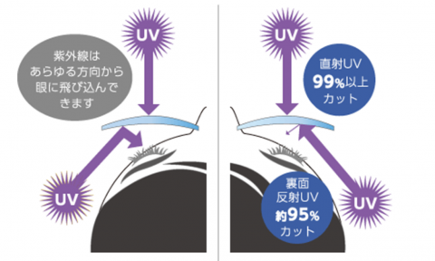 紫外線は360°どの方向からでもやってきます。標準レンズのUVカットは、前方からの紫外線にのみ効果を発揮しますが、後方から“レンズに反射“して眼に入る紫外線はカットできていません。