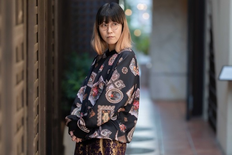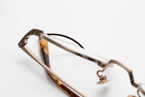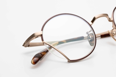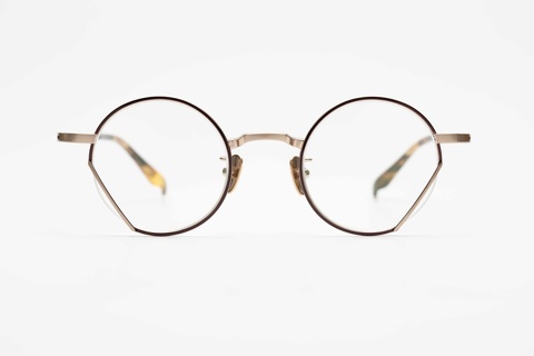 ナイロール構造によって支えられたレンズは、文字通りラウンドシェイプになりますが、折り曲げたリムが正面から見ると直線になり、なんとも不思議な玉型に。まさにコンセプトにある「調和と不協和」を感じさせるデザインです。