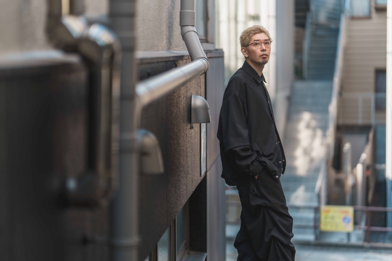 ここ最近、ワタクシはジーンズなどカジュアルなテイストに移行しつつありますが、撮影を行う前日「YA-002」も含めた「YOSHINORI AOYAMA」の新作にはどういったスタイリングが相性が良いのか?松本と打ち合わせを行い、結果としてこの日はオーバーサイズでありながらシンプルな黒を基調としたセットアップ、松本は普段よりは柄が少なめ?+ジャケットでキレイめなスタイルにしてみました。普段アセテートフレームがメインの我々にとってメタルフレームのスタイリングは全くベツモノであり新鮮ですね。