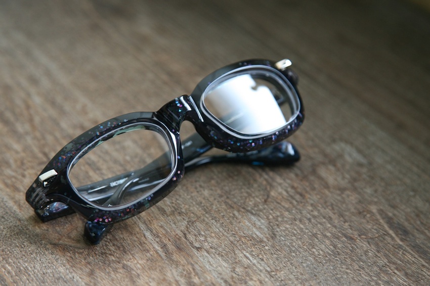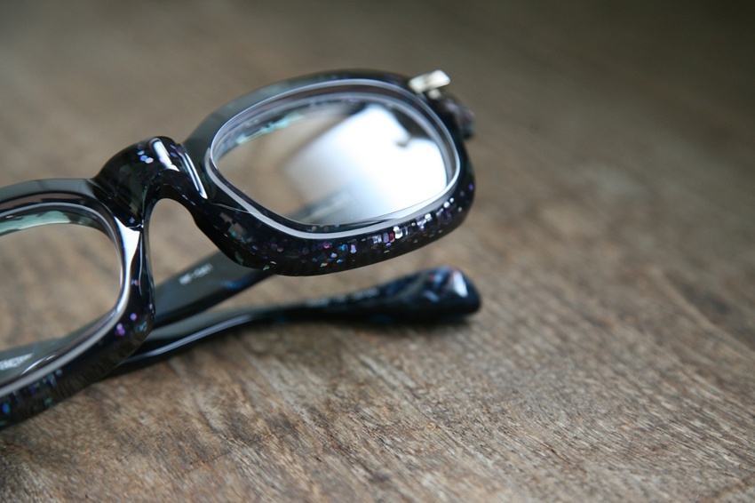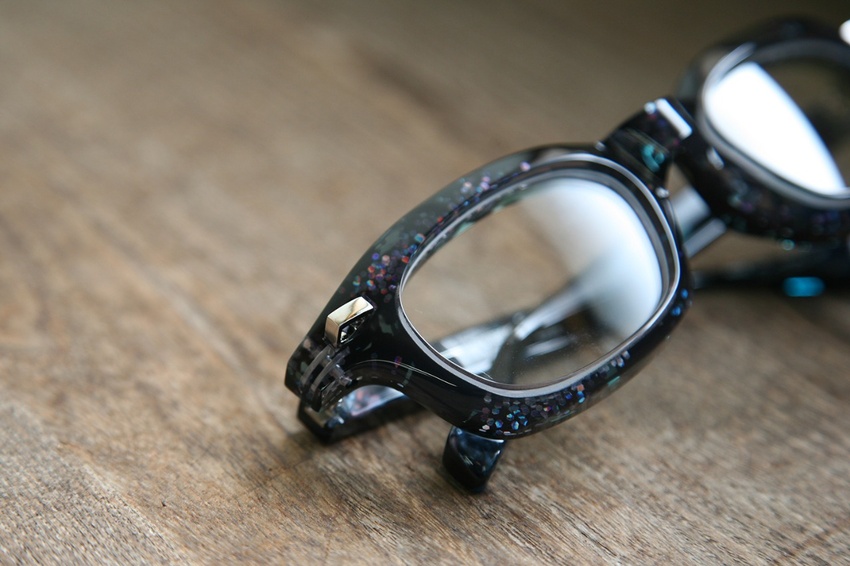 「宇宙玉のイメージでつくりたい」という古田氏からの要望に答える為、現場の皆とサンプルづくりに挑みました。2種類の厚みの違うアセテートの間に、ラメパウダー、グリッター、ホログラム…など、宇宙玉に近いイメージのものを挟み生地作りから始めました。貼り合わせる生地の厚み(比率)を調整し、通常のラインナップでは使用しないようなバランスにし、より奥行きが感じられる不思議な雰囲気を醸し出すカラーになったのではないでしょうか。