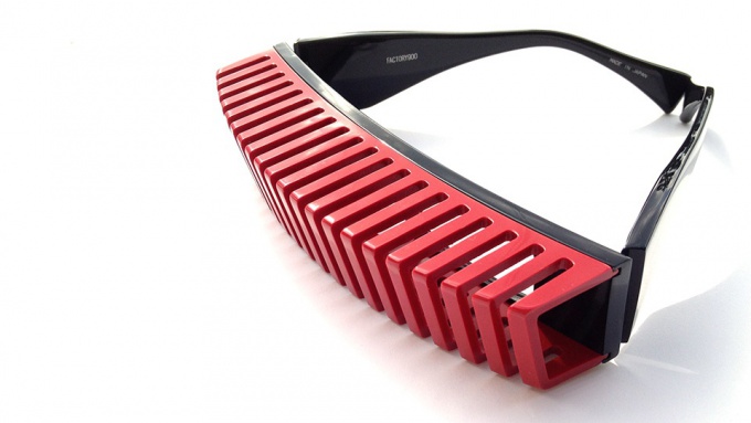 縦にスリットの入った立体的なパーツと、平面的なフロントを別パーツで作り、それを組み合わせることにより、レンズとの間に空間が生まれる構造体を作り出した。その構造体はメガネというよりは、まさに建造物を彷彿とさせるようなスタイルとなっている。
