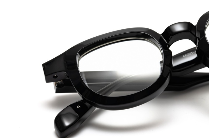 RF-001の玉型違い。レンズ形状はオーソドックスなスクエアウェリントンにすることで、フロント前部に施された立体感をより際立たせている。四角く肉厚なリムに直線的なラインで、ソリッドな印象があるものの、絶妙なサイズ感はスタイリングを問わず着用できる。シンプルな形状ながら、アセテートの質感を存分に感じとる事ができるモデル。