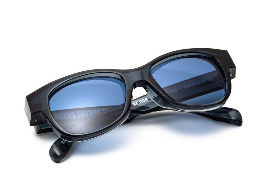 14mm厚のアセテートを使用し、大きめのウェリントン型に仕上げたRF-008は、エッジを立てて重さを払拭した。磨き上げられた肉厚のフロント、研ぎ澄まされたカット面は、シンプルな造形だからこそダイレクトにアセテート本来の美しさを引き立てる。洗練された造形面は、全体のボリュームに相反してどこか躍動感をもたらし、様々なシーンに映える様デザインされている。