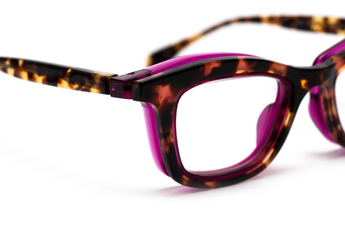 薄いフロントパーツの背面に左右で独立したパーツを組み合わせ、二つのパーツの間に隙間を作ることで、一枚のアセテートだけでは表現できない奥行きと立体感を生み出した。レンズ形状はオーソドックスなウェリントン型を採用し、ギミックの効いた造形と絶妙なバランスを保っている。